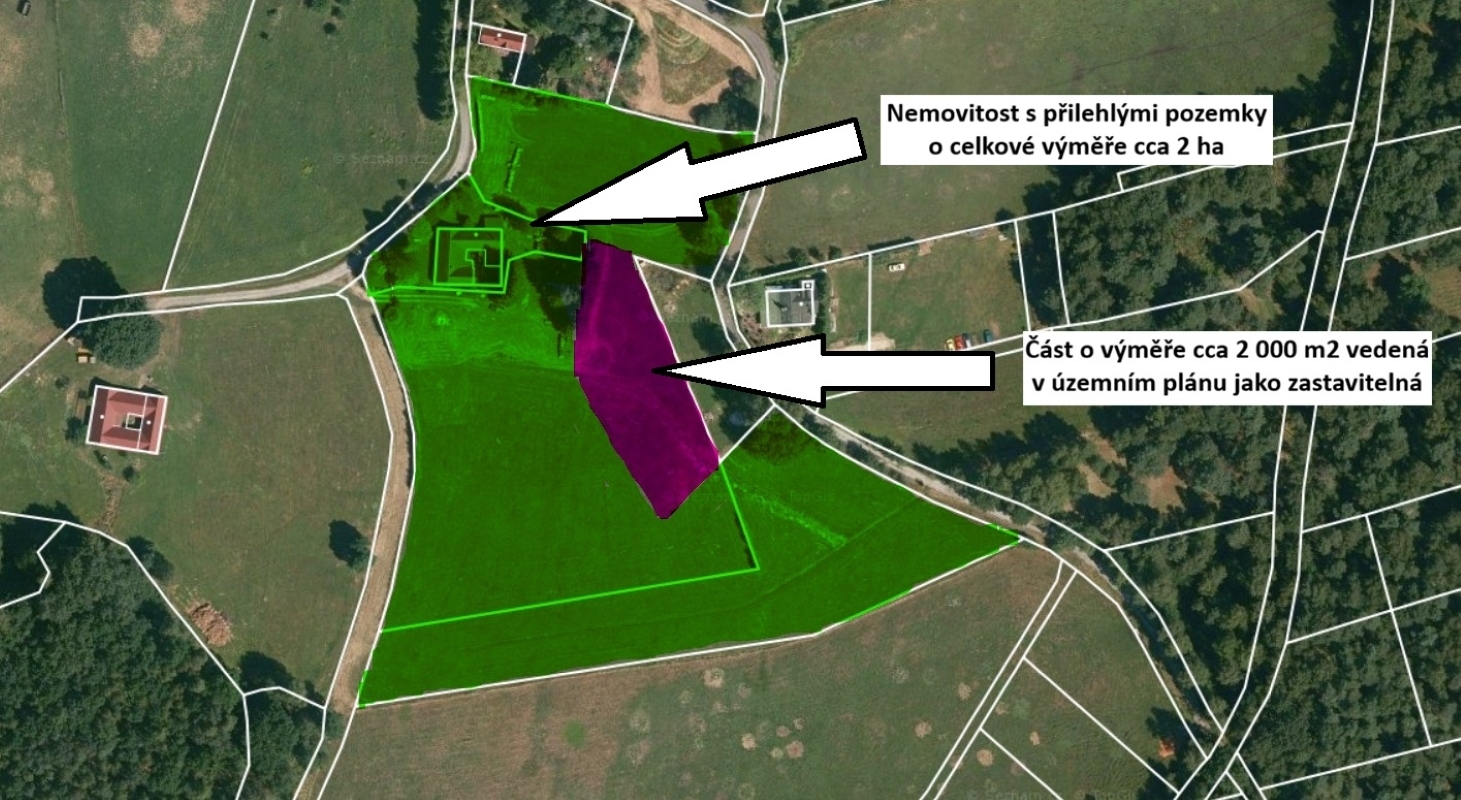 V exkluzivním zastoupení majitele nabízíme velmi zajímavý rodinný dům v malebné oblasti na okraji Třeboňské pánve. Tato rovinatá oblast je charakteristická samostatně situovanými, polouzavřenými venkovskými staveními s rozlehlými okolními pozemky. Právě takový objekt, který prošel před cca deseti lety rekonstrukcí, Vám nabízím. Jedná se o dům o užitné ploše přízemí cca 130 m2. V přízemí je vstupní chodba, obrovský obytný prostor s jídelnou a kuchyní, pokoj, technická místnost a velká koupelna. Po schodech se jde do podkroví, které je o přibližně stejně velké podlahové ploše. Jsou zde situovány dva pokoje, ložnice a velký pokoj jako herna pro děti. Protože tyto místnosti mají nízkou světlou výšku a navíc nejsou dostatečně osvětleny přirozeným světlem, není možno je uvádět jako obytné. Jeden horní půdní pokoj má veliké okno s výhledem do zeleně. Do tohoto pokoje je připraven samostatný přístup z přízemního pokoje. Pouze je potřeba dodělat schody. Vytápění domu je ústřední - kombinace podlahového topení a radiátorů - s kotlem na tuhá paliva a akumulačními nádržemi. Zároveň jsou přímo v obývací části další kamna, napojená na samostatný komín. Ohřev vody je řešen částečně akumulačním bojlerem, který je nahříván kotlem a částečně elektrickým bojlerem. Protože PENB se teprve zpracovává uvádíme ze zákonných důvodů energetickou třídu "G", ale vzhledem k tloušťce zdí, zateplení objektu a způsobu vytápění, vyjde určitě energetická třída lépe. K nemovitosti náleží velké okolní pozemky s celkovou výměrou cca 2 ha. Část těchto pozemků o velikosti cca 2000 m2 je v územním plánu vedena jako zastavitelná rodinným domem. V ceně je zároveň část lesa s převážně borovým porostem o výměře cca 1,3 ha. V případě zájmu je možno ještě přikoupit další louku o výměře cca 0,83 ha, a využít ji například jako pastvinu. Majitel je také ochoten prodat techniku pro udržování pozemků ( traktor, balíkovačku, žací lištu ... ). Jedná se o velmi zajímavou nemovitost v krásné přírodě s velkými pozemky a možností výstavba dalšího domu. V případě zájmu mne neváhejte kontaktovat, rád s vámi uskutečním prohlídku.